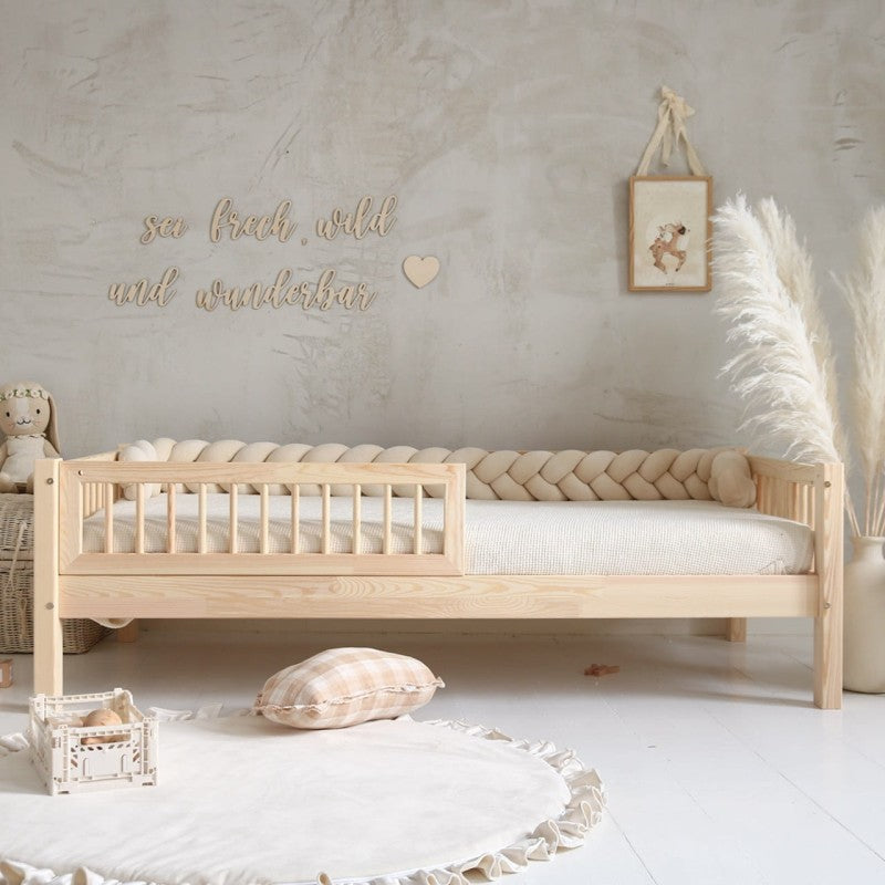- Tilpasning: Overvej at tilføje en sengehest for ekstra tryghed. Dette er især vigtigt i overgangsperioden fra tremmeseng til juniorseng.